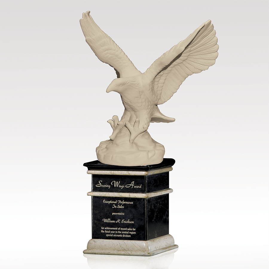 Perfection in flight is captured in this cream colored porcelain sculpture atop the black marble base with cappuccino marble accents.